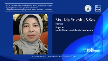 Another presentation was delivered by Ms. Ida Yusnita, a journalist from mediabanjarmasin.com, Indonesia, under the theme “Peace: A Human Right That We Must Protect Together.” She defined peace not merely as the absence of war, but as a condition grounded in security, equality, and justice, requiring collective responsibility.