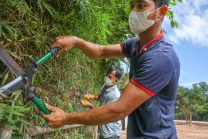 Vouen Dy (right) and Chhoun Sothai (left) trim the hedges around Phare, The Cambodian Circus in preparation for Cambodia’s reopening to tourists. Photo: Anton L. Delgado