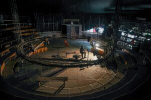 A layer of dust covered the surfaces underneath the performance tent at Phare, The Cambodian Circus. Huon Harb, the troupe’s director of operations, walked around the dimly lit tent, glancing at the rows of empty bleachers.
