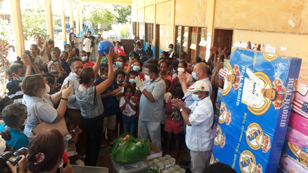 Iha atividade apoiu umanitária ne’e, MEJD reprezenta governu, akompañia husi Embaxidor Portugal no parseiru servisu sira hanesan Unicef hala’o observasun dahuluk iha edifisiu INFORDEPE Balide ne’ebé akumula komunidade sira hamutuk xefi familia (112 no tatol ema 589) , Eskola 4 de setembru, xefe familia hamutuk (57 no ema 235 ) ,Eskola EBF Meti-Aut, xefe familia hamutuk (15, ema 85 pesoas), eskola EBF 15 de outubru Tasi-tolu xefe familia hamutuk (174 no ema 836), eskola 10 de dezembru Komoro uma kain hamutuk 15 no ema 74, hodi fahe ai-han hanesaan foos ,mina, livru ba labarik sira, esponja hodi toba inklui sasan ne’ebé atu proteje ijiéne.
