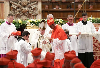 Kardeál sira ne’e, simu investidura hosi Papa Francisco hodi fó kadeli kardinalísiu no halo sira nia juramentu no koloka barrete (chapeu com 3 ou 4 pontas) iha sira nia ulun, no chapéu (barrete) ne’e hola parte iha vestimenta litúrgika nu’udar sinal de dignidade kardinalatu ho nia signifikadu hala’o misaun Jesus Cristo nian ho korajen no barani fakar nia raan hodi tane nafatin fe kristaun no doutrina sira hodi “sai roman ba sarani tomak Maromak nian.