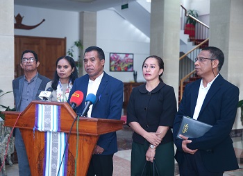 Portavoz PLP, Deometrio Amaral deklara asuntu ne’e ba jornalista sira hafoin remata enkontru ho Prezidente Repúblika José Ramos-Horta, Sesta (03/02/2023), iha palasiu prezidénsial Nicolao Lobato Bairopité Dili Timor Leste.